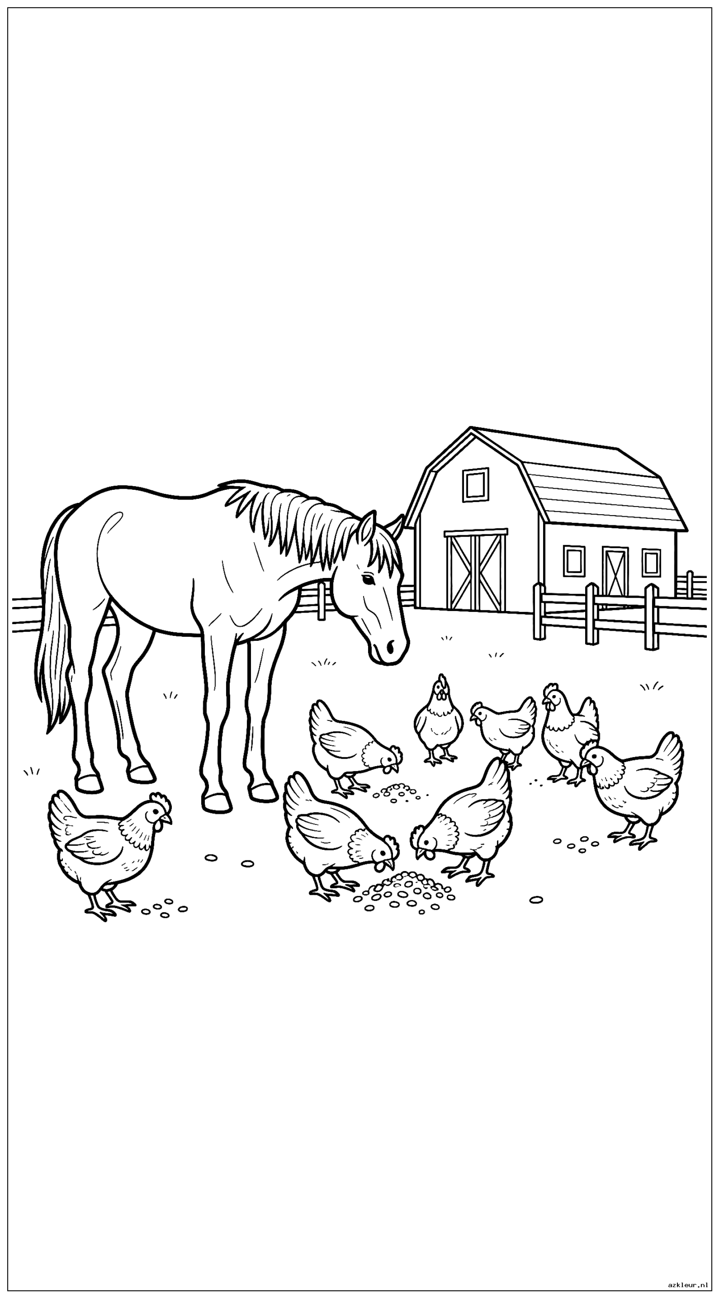 Ontdek hoe paarden samenleven met andere boerderijbewoners in deze vrolijke collectie kleurplaten. Je vindt hier scènes waarin paarden gezellig samen zijn met koeien, schapen, kippen en andere boerderijvrienden. Perfect om kinderen te leren over het leven op de boerderij!