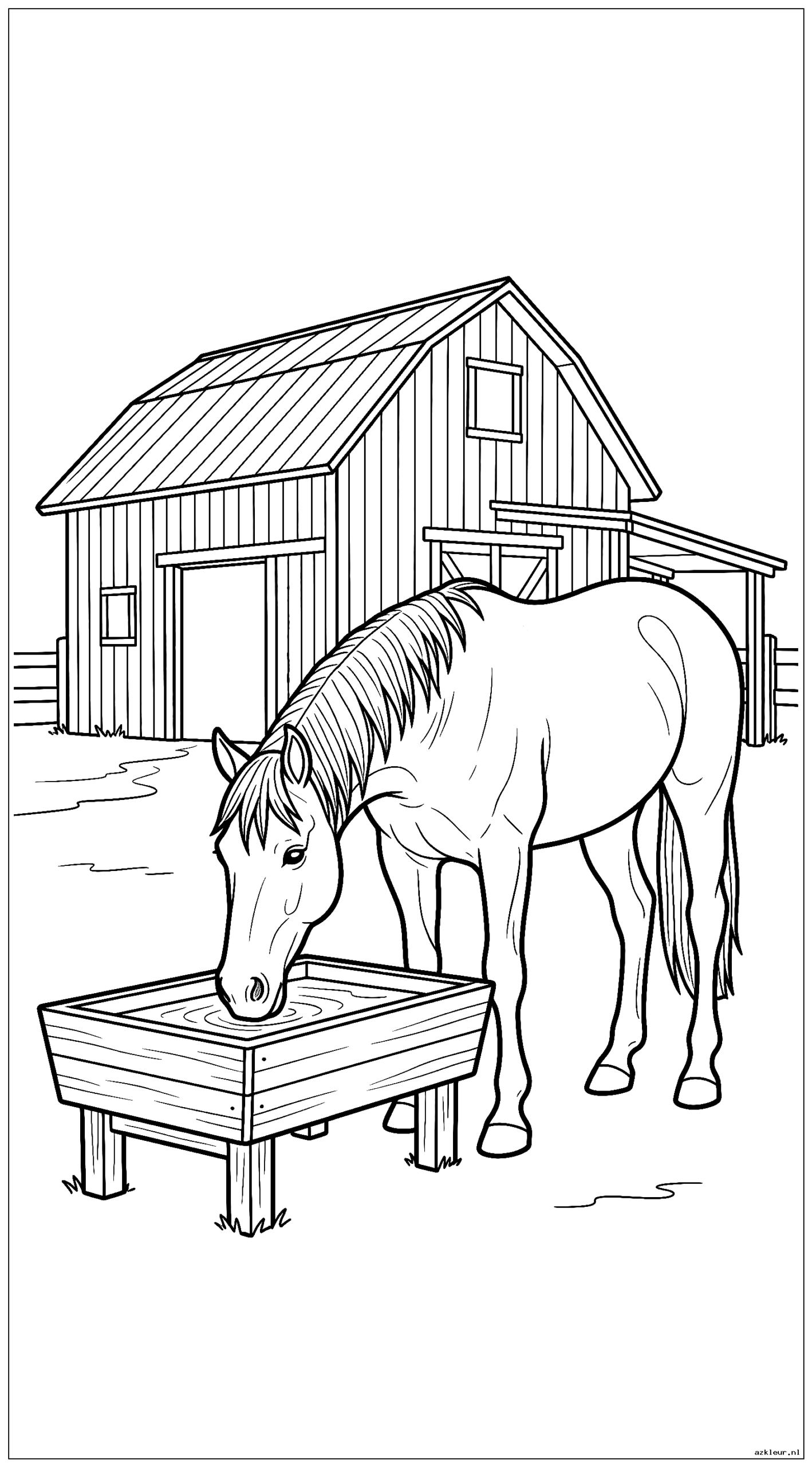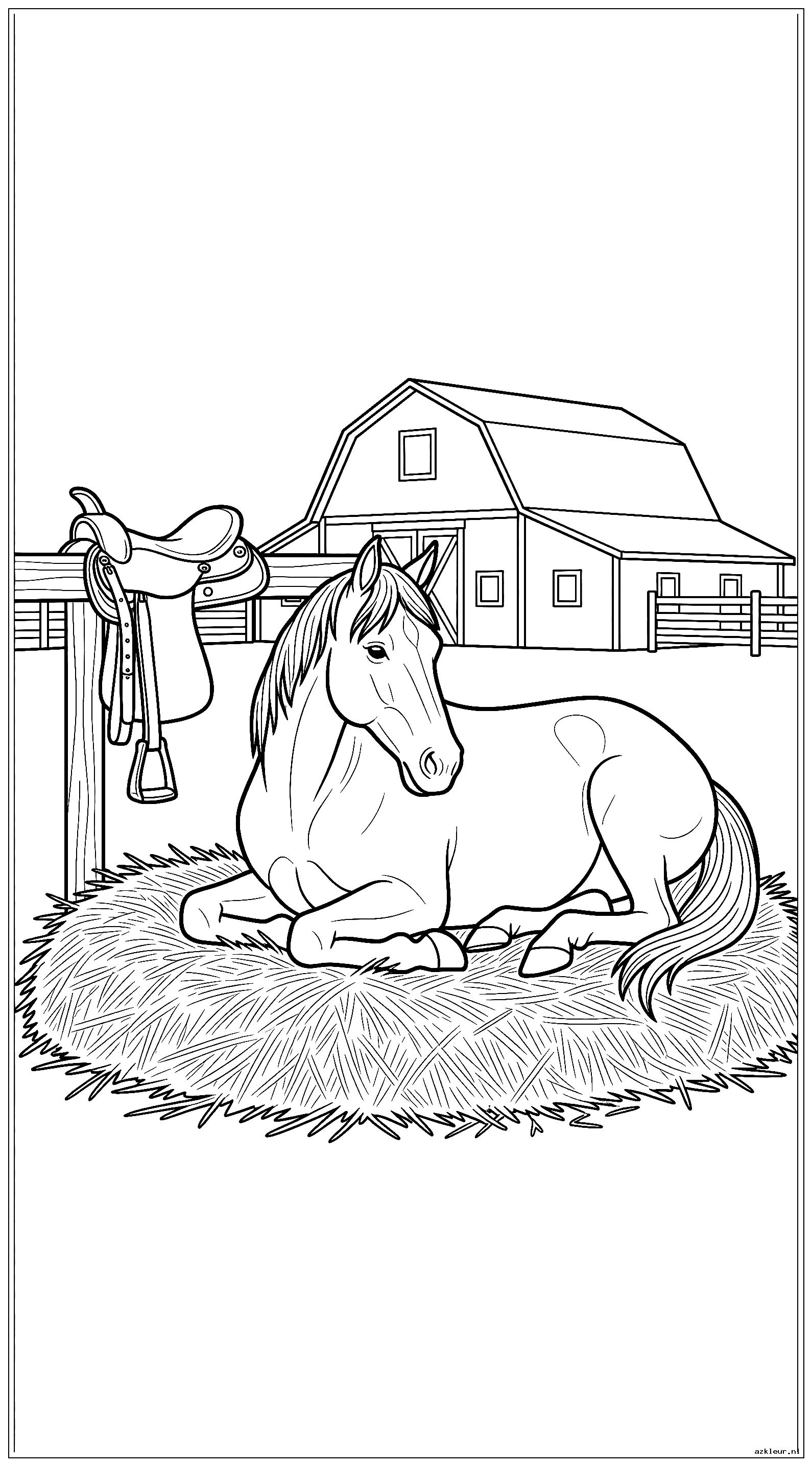 Ontdek het leven van paarden binnen in de stal met deze sfeervolle kleurplaten. Je ziet paarden in hun eigen leefomgeving, sommige rustend in het stro, andere etend van hun hooi. Deze tekeningen geven een mooi beeld van het dagelijks leven in de stal.
