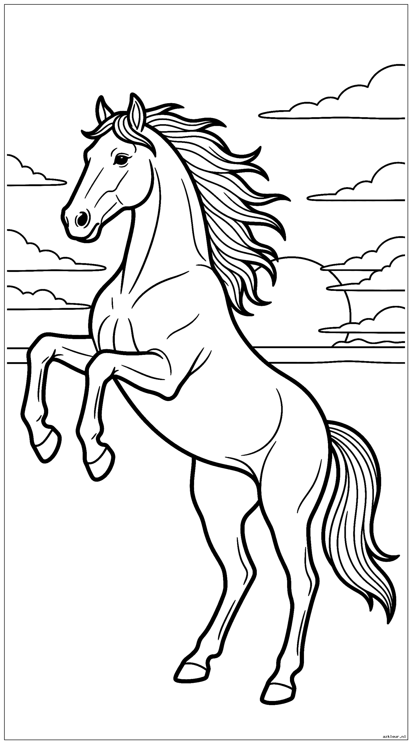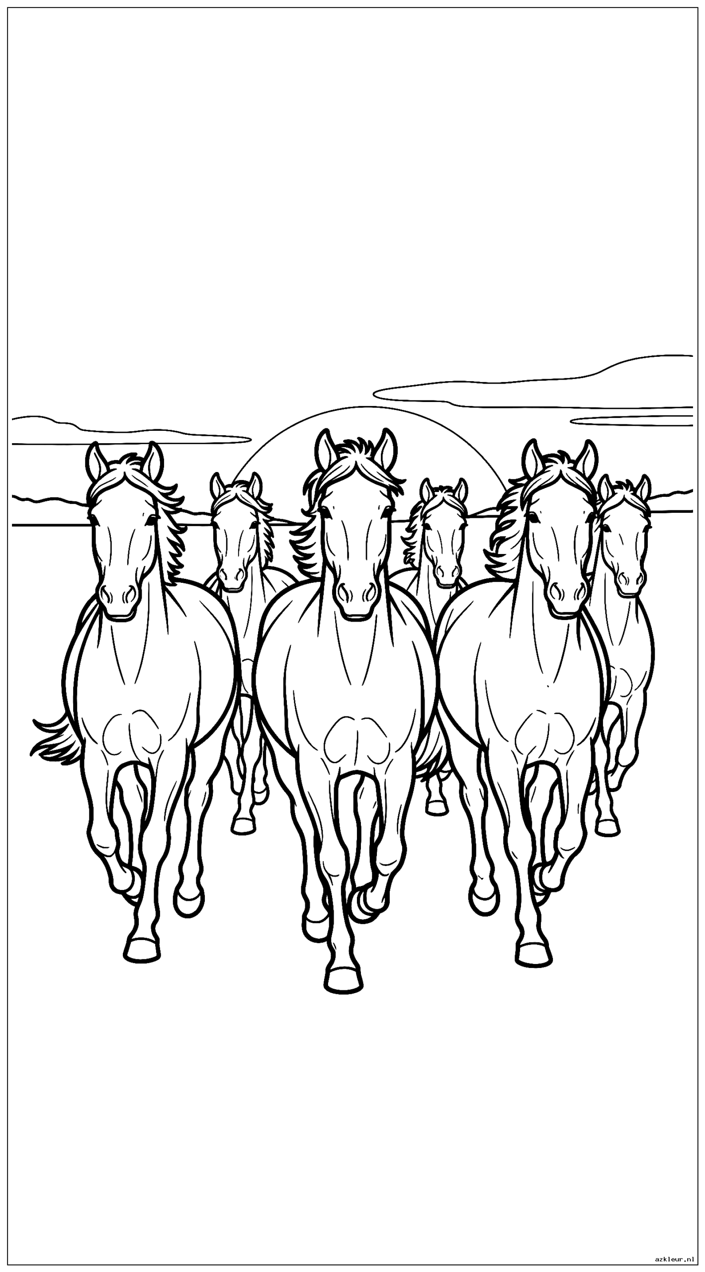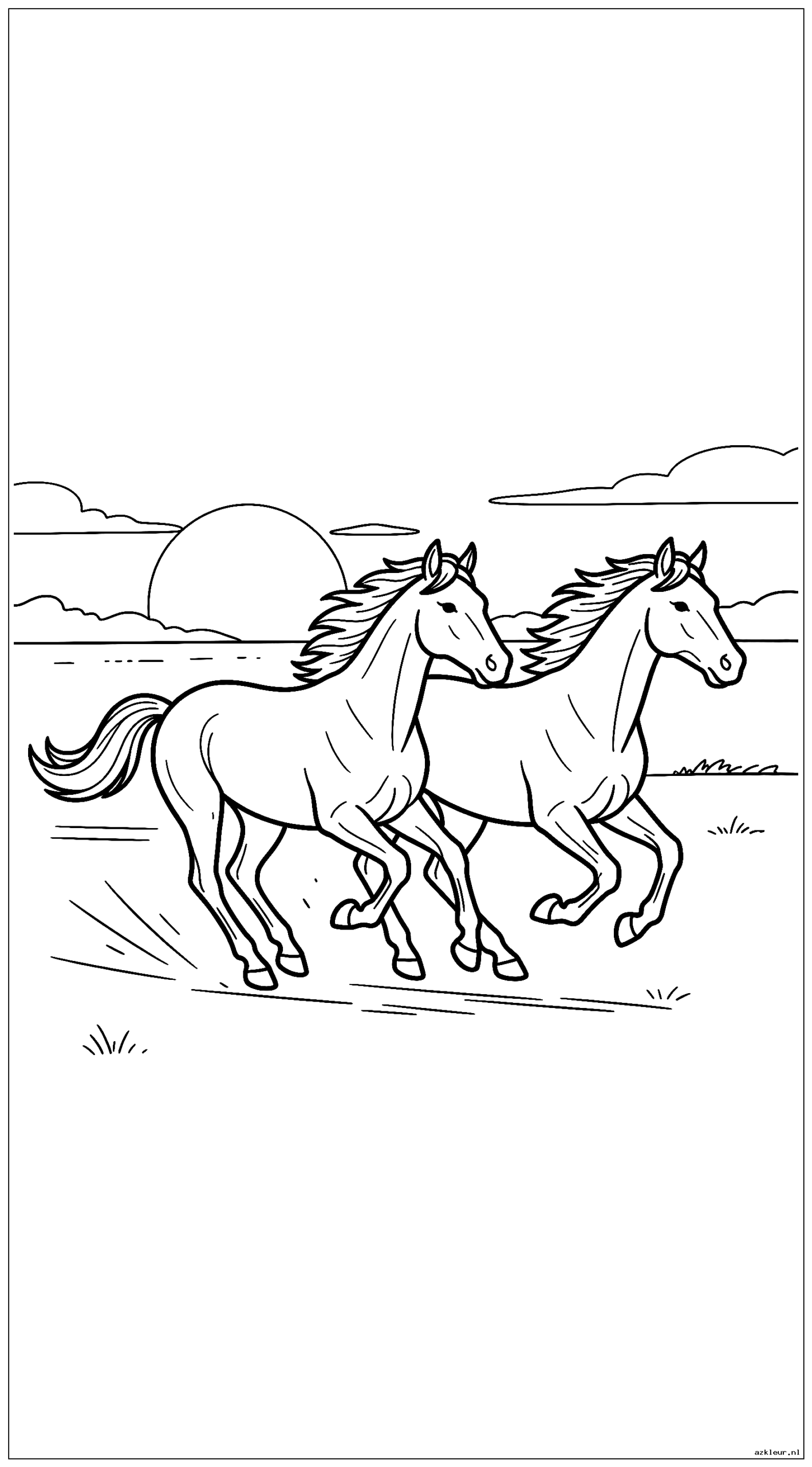 Vang de pure energie en kracht van rennende paarden in deze dynamische kleurplaten. Elke afbeelding toont paarden in volle beweging, met wapperende manen en krachtige poses tegen een dramatische zonsondergang. Deze kleurplaten zijn perfect om de dynamische pose van galopperende paarden vast te leggen.