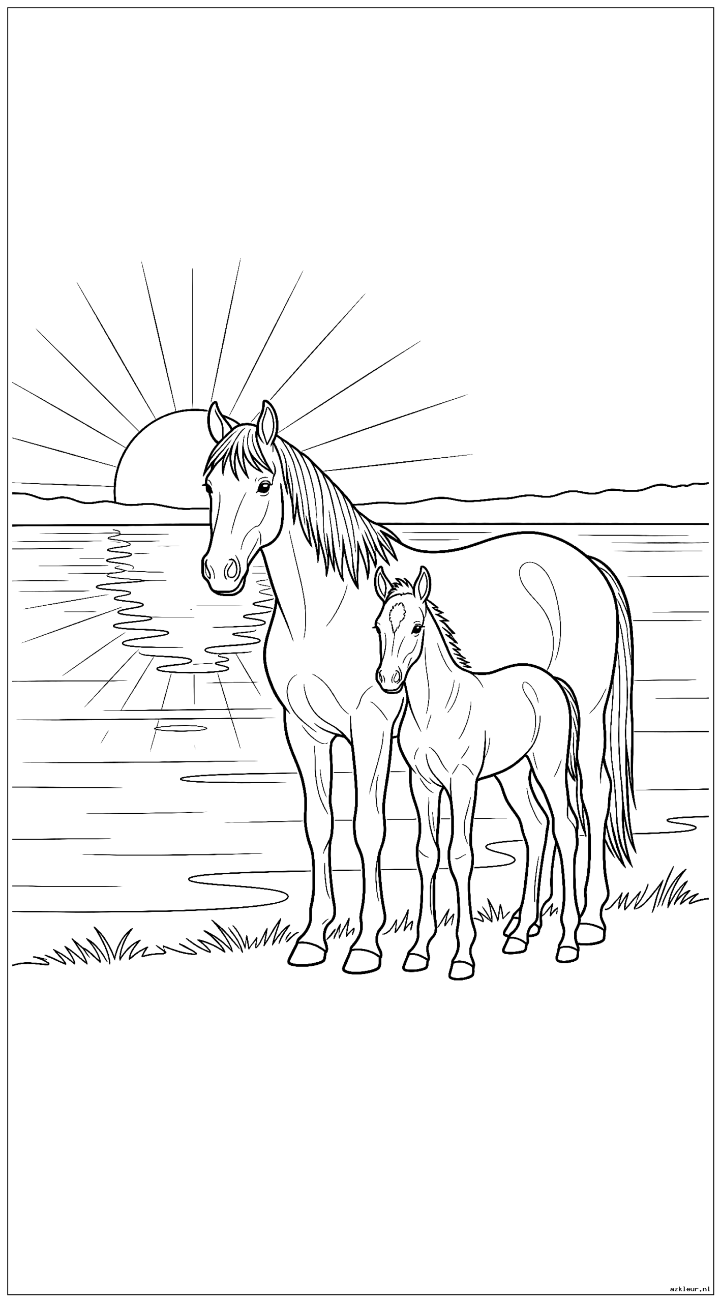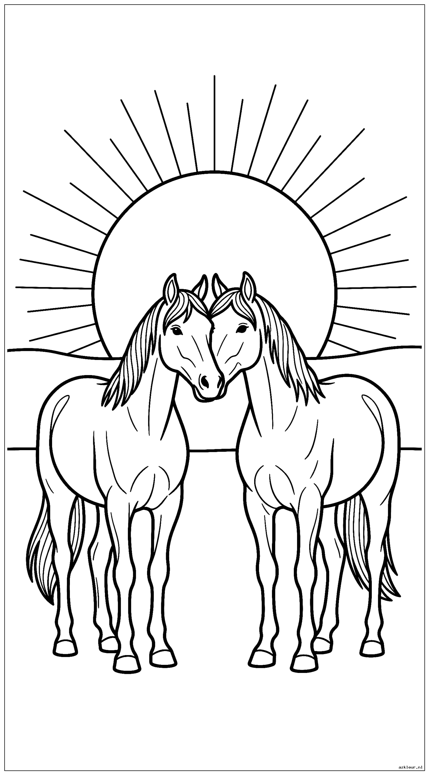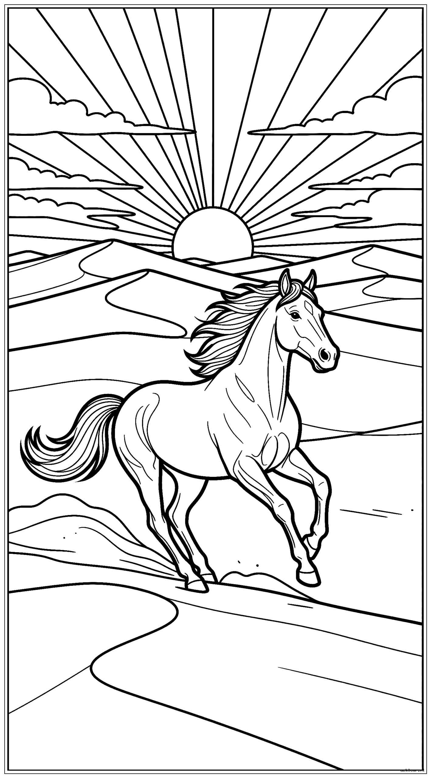 Ontdek onze prachtige collectie kleurplaten waar de majestueuze schoonheid van paarden wordt gecombineerd met de betoverende kleuren van de zonsondergang. Deze unieke kleurplaten zijn perfect voor zowel kinderen als volwassenen die van paarden en natuurlijke taferelen houden.