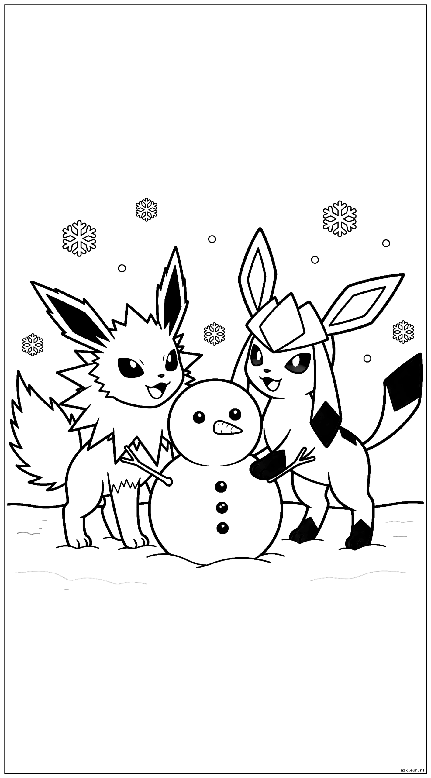 Schattige Jolteon en Glaceon die in de winter een sneeuwpop bouwen